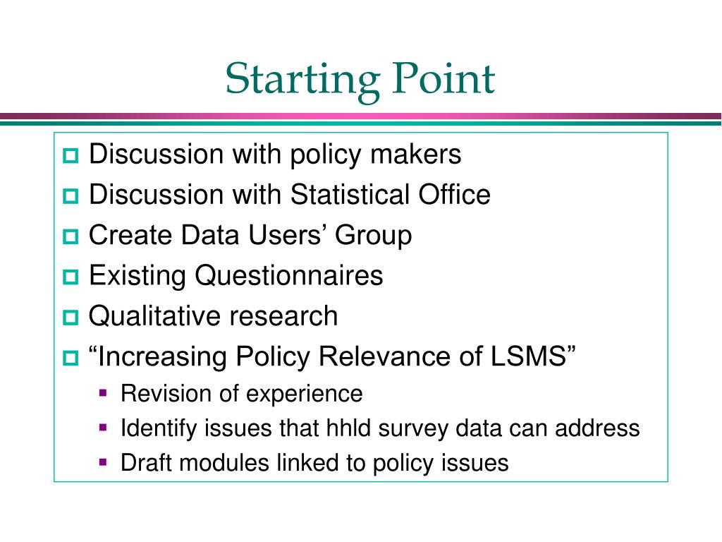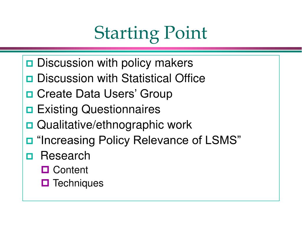 Starting Point • Discussion with policy makers • Discussion with Statistical Office • Create Data Users’ Group • Existing Questionnaires • Qualitative/ethnographic work • “Increasing Policy Relevance of LSMS” • Research • Content • Techniques