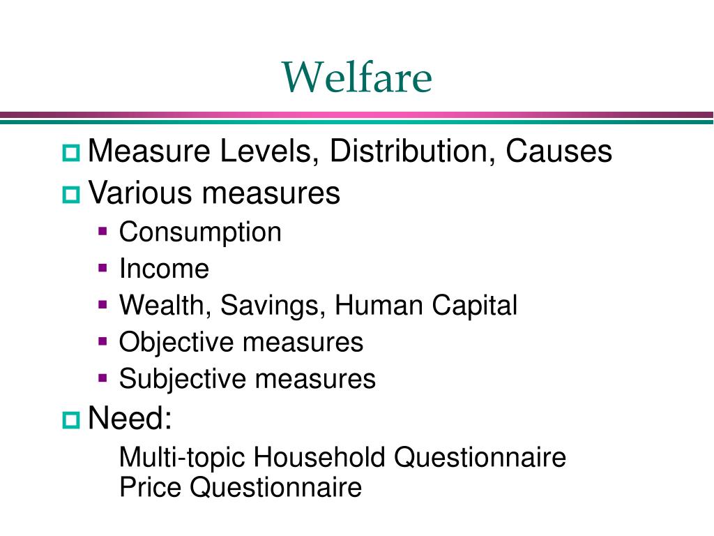 Welfare • Measure Levels, Distribution, Causes • Various measures • Consumption • Income • Wealth, Savings, Human Capital • Objective measures • Subjective measures • Need: • Multi-topic Household Questionnaire Price Questionnaire