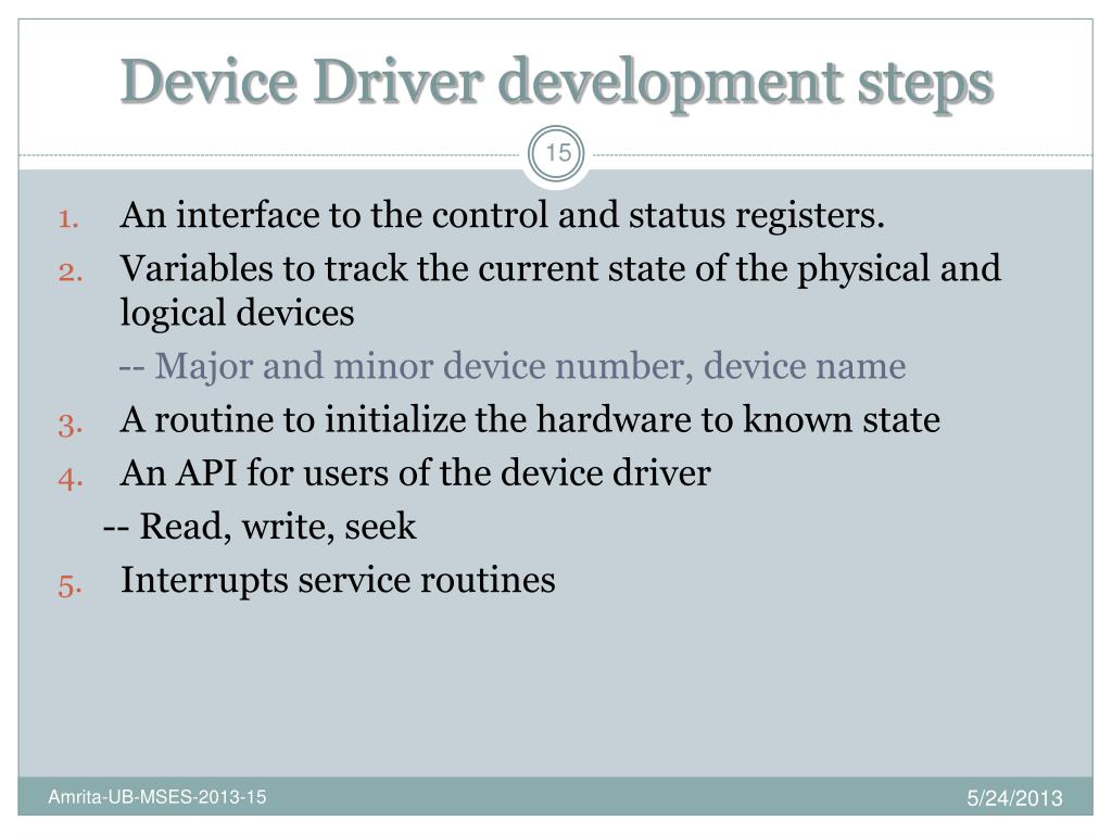 Device Driver development steps • An interface to the control and status registers. • Variables to track the current state of the physical and logical devices -- Major and minor device number, device name • A routine to initialize the hardware to known state • An API for users of the device driver -- Read, write, seek • Interrupts service routines Amrita-UB-MSES-2013-15