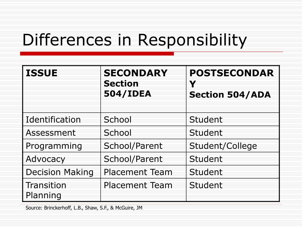 Differences in Responsibility Source: Brinckerhoff, L.B., Shaw, S.F., & McGuire, JM