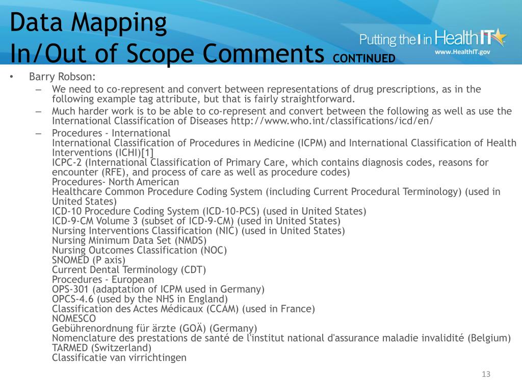 Data MappingIn/Out of Scope Comments CONTINUED • Barry Robson: • We need to co-represent and convert between representations of drug prescriptions, as in the following example tag attribute, but that is fairly straightforward. • Much harder work is to be able to co-represent and convert between the following as well as use the International Classification of Diseases http://www.who.int/classifications/icd/en/ • Procedures - InternationalInternational Classification of Procedures in Medicine (ICPM) and International Classification of Health Interventions (ICHI)[1]ICPC-2 (International Classification of Primary Care, which contains diagnosis codes, reasons for encounter (RFE), and process of care as well as procedure codes)Procedures- North AmericanHealthcare Common Procedure Coding System (including Current Procedural Terminology) (used in United States)ICD-10 Procedure Coding System (ICD-10-PCS) (used in United States)ICD-9-CM Volume 3 (subset of ICD-9-CM) (used in United States)Nursing Interventions Classification (NIC) (used in United States) Nursing Minimum Data Set (NMDS)Nursing Outcomes Classification (NOC)SNOMED (P axis)Current Dental Terminology (CDT)Procedures - EuropeanOPS-301 (adaptation of ICPM used in Germany)OPCS-4.6 (used by the NHS in England) Classification des ActesMédicaux (CCAM) (used in France)NOMESCOGebührenordnungfürärzte (GOÄ) (Germany)Nomenclature des prestations de santé de l'institut national d'assurancemaladieinvalidité (Belgium)TARMED (Switzerland)Classificatie van virrichtingen