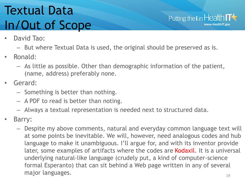 Textual DataIn/Out of Scope • David Tao: • But where Textual Data is used, the original should be preserved as is. • Ronald: • As little as possible. Other than demographic information of the patient, (name, address) preferably none. • Gerard: • Something is better than nothing. • A PDF to read is better than noting. • Always a textual representation is needed next to structured data. • Barry: • Despite my above comments, natural and everyday common language text will at some points be inevitable. We will, however, need analogous codes and hub language to make it unambiguous. I’ll argue for, and with its inventor provide later, some examples of artifacts where the codes are Kodaxil. It is a universal underlying natural-like language (crudely put, a kind of computer-science formal Esperanto) that can sit behind a Web page written in any of several major languages.