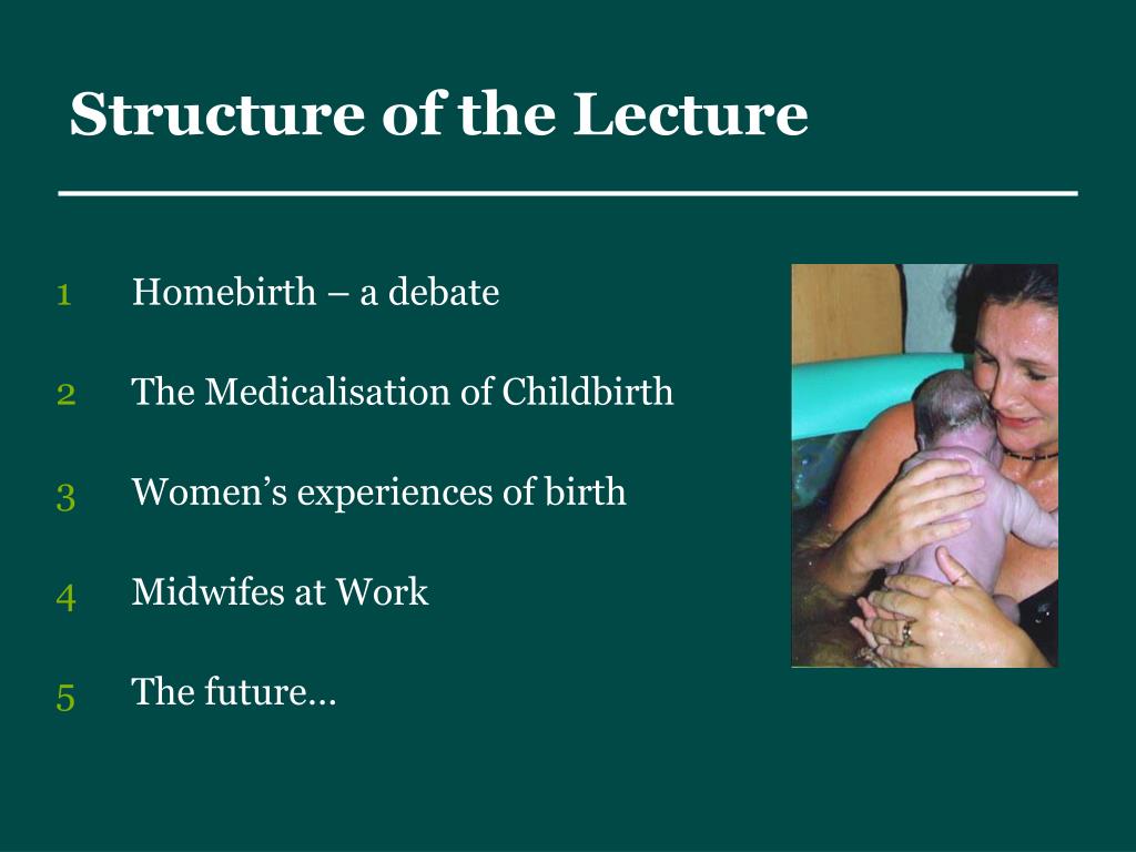 Structure of the Lecture • Homebirth – a debate • The Medicalisation of Childbirth • Women’s experiences of birth • Midwifes at Work • The future…