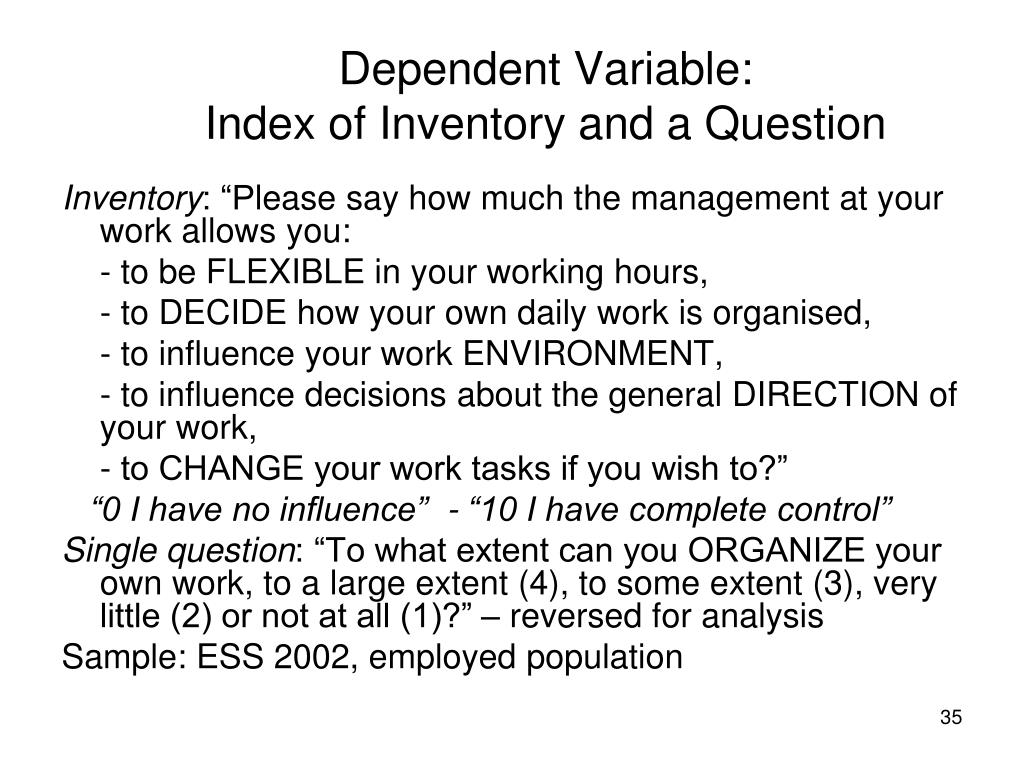 Dependent Variable: Index of Inventory and a Question Inventory: “Please say how much the management at your work allows you: - to be FLEXIBLE in your working hours, - to DECIDE how your own daily work is organised, - to influence your work ENVIRONMENT, - to influence decisions about the general DIRECTION of your work, - to CHANGE your work tasks if you wish to?” “0 I have no influence” - “10 I have complete control” Single question: “To what extent can you ORGANIZE your own work, to a large extent (4), to some extent (3), very little (2) or not at all (1)?” – reversed for analysis Sample: ESS 2002, employed population