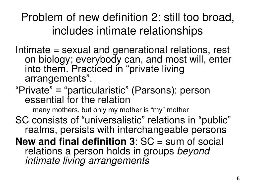 Problem of new definition 2: still too broad, includes intimate relationships Intimate = sexual and generational relations, rest on biology; everybody can, and most will, enter into them. Practiced in “private living arrangements”. “Private” = “particularistic” (Parsons): person essential for the relation many mothers, but only my mother is “my” mother SC consists of “universalistic” relations in “public” realms, persists with interchangeable persons New and final definition 3: SC = sum of social relations a person holds in groups beyond intimate living arrangements