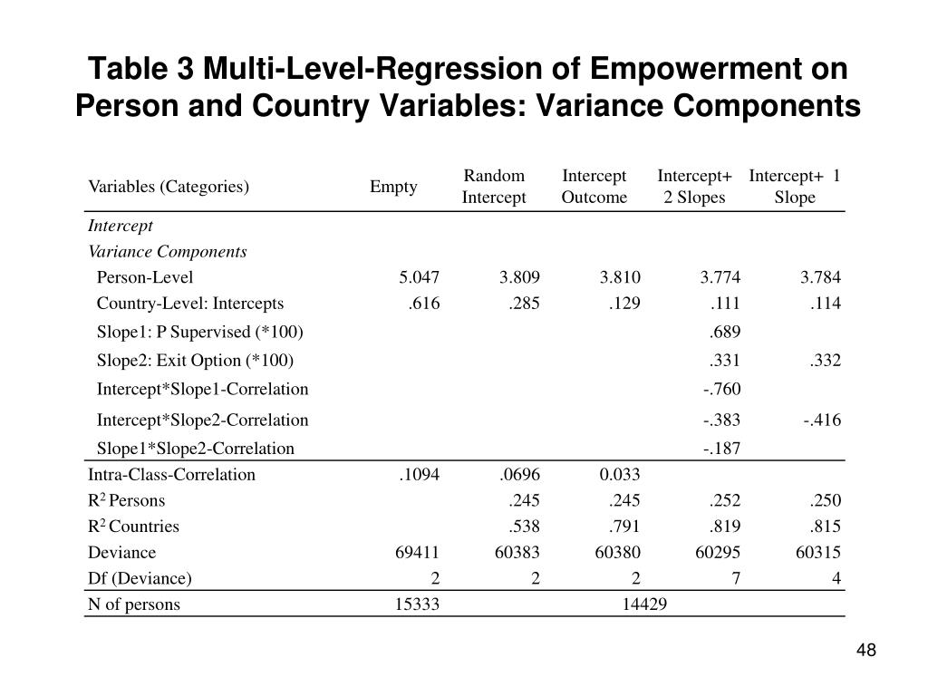 Quantity of intercept and slope effects Mean:country 25 percentage points above grand mean > predicted intercept of 5.472 + 0.019*25=5.947, half a point on 11 point scale of empowerment. Slope: country 25 percentage points above mean > predicted slope for • people sv.: .456 + (-.00298*25) = .382 • exit option: .216 + (-.00174*25) = .172.