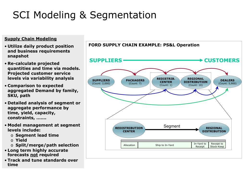 SCI Modeling & Segmentation • Supply Chain Modeling • Utilize daily product position and business requirements snapshot • Re-calculate projected quantities and time via models. Projected customer service levels via variability analysis • Comparison to expected aggregated Demand by family, SKU, path • Detailed analysis of segment or aggregate performance by time, yield, capacity, constraints, ……. • Model management at segment levels include: • Segment lead time • Yield • Split/merge/path selection • Long term highly accurate forecasts not required • Track and tune standards over time FORD SUPPLY CHAIN EXAMPLE: PS&L Operation Demand SUPPLIERS CUSTOMERS REDISTRIB.CENTER(Count: 1) REGIONALDISTRIBUTION(Count: 10) SUPPLIERS(Count: 2,000) PACKAGERS(Count: 7) DEALERS(Count: 5,900) REDISTRIBUTIONCENTER REGIONALDISTRIBUTION Segment Allocation Ship to In-Yard In-Yard toReceipt Receipt toStock-Keep INTERVALS