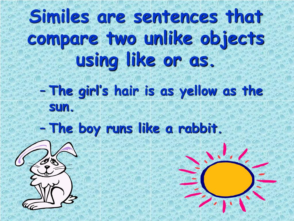 Similes are sentences that compare two unlike objects using like or as. • The girl’s hair is as yellow as the sun. • The boy runs like a rabbit.