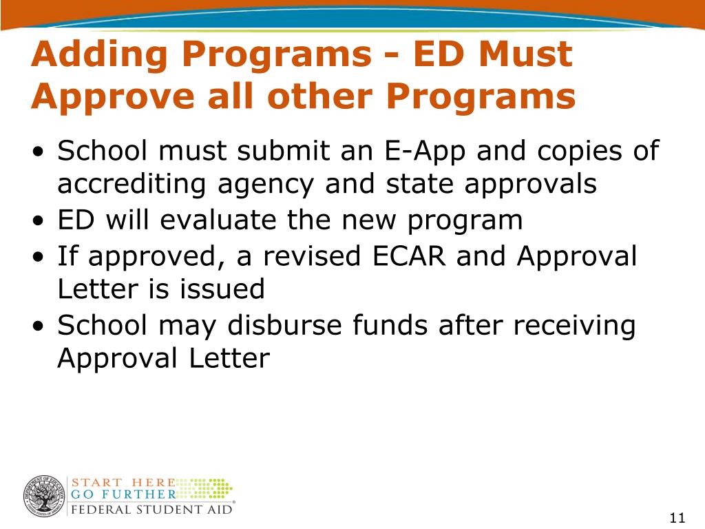 Adding Programs - ED Must Approve all other Programs • School must submit an E-App and copies of accrediting agency and state approvals • ED will evaluate the new program • If approved, a revised ECAR and Approval Letter is issued • School may disburse funds after receiving Approval Letter