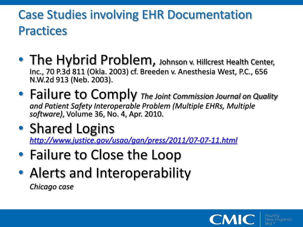 Case Studies involving EHR Documentation Practices The Hybrid Problem, Johnson v. Hillcrest Health Center, Inc., 70 P.3d 811 (Okla. 2003) cf. Breeden v. Anesthesia West, P.C., 656 N.W.2d 913 (Neb. 2003). Failure to Comply The Joint Commission Journal on Quality and Patient Safety Interoperable Problem (Multiple EHRs, Multiple software), Volume 36, No. 4, Apr. 2010. Shared Logins http://www.justice.gov/usao/gan/press/2011/07-07-11.html Failure to Close the Loop Alerts and Interoperability Chicago case