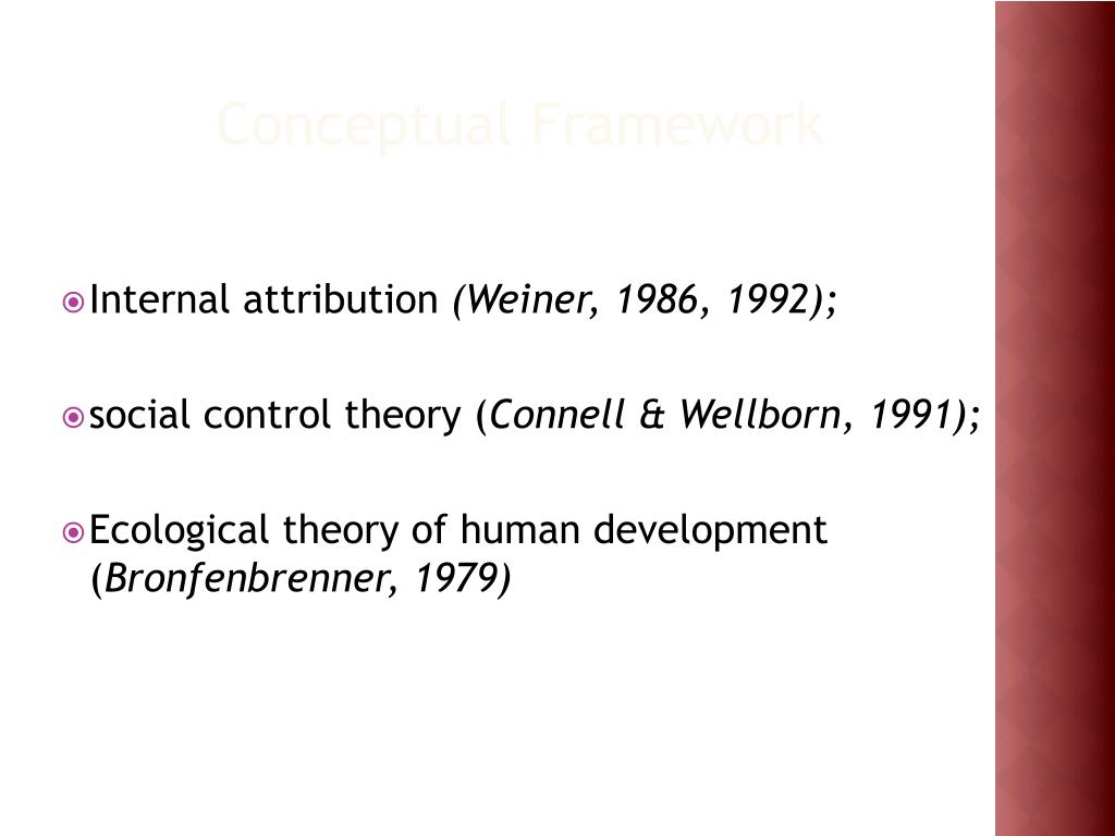Conceptual Framework • Internal attribution (Weiner, 1986, 1992); • social control theory (Connell & Wellborn, 1991); • Ecological theory of human development (Bronfenbrenner, 1979)