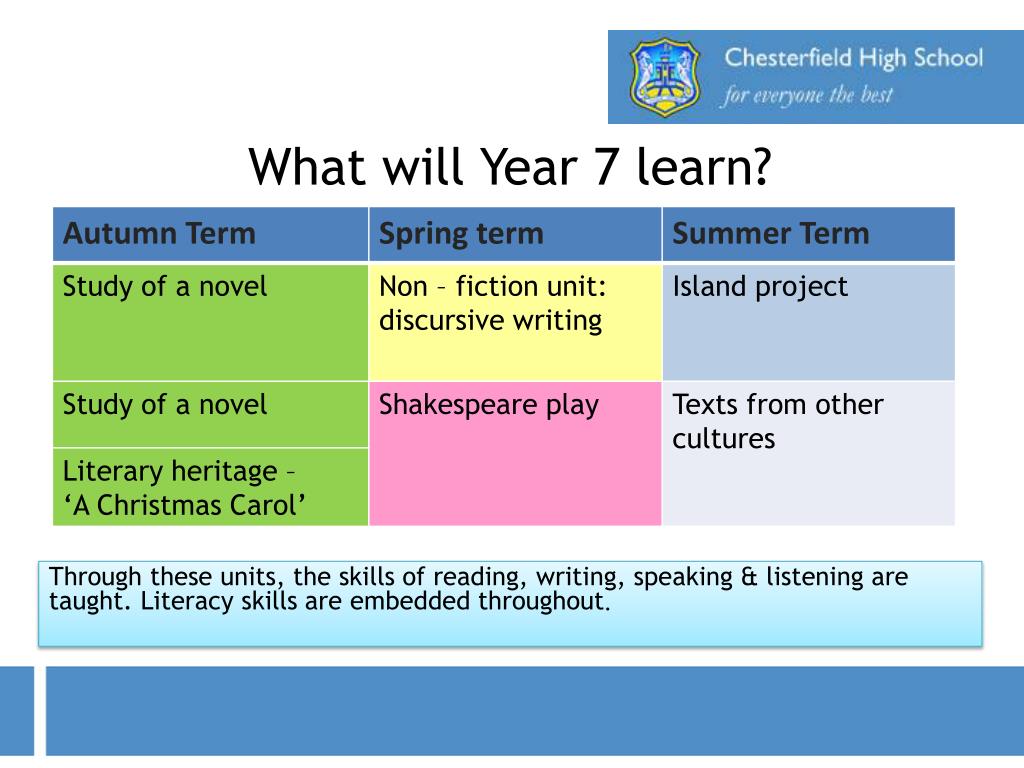 What will Year 7 learn? Through these units, the skills of reading, writing, speaking & listening are taught. Literacy skills are embedded throughout.