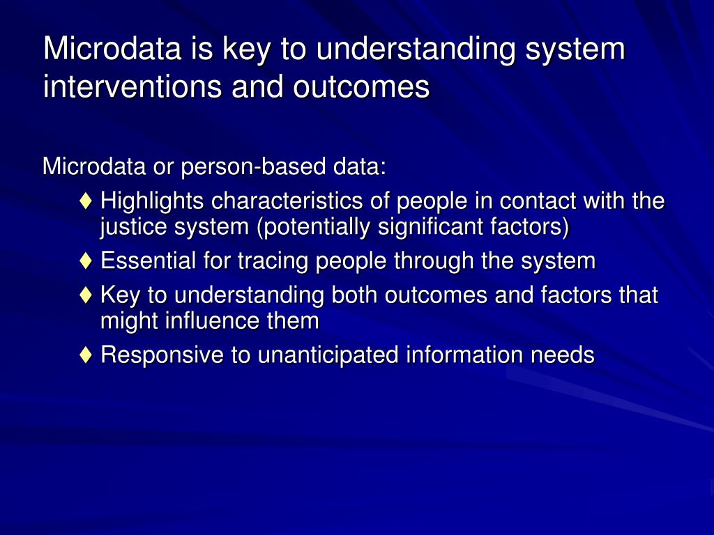 Microdata is key to understanding system interventions and outcomes Microdata or person-based data: • Highlights characteristics of people in contact with the justice system (potentially significant factors) • Essential for tracing people through the system • Key to understanding both outcomes and factors that might influence them • Responsive to unanticipated information needs