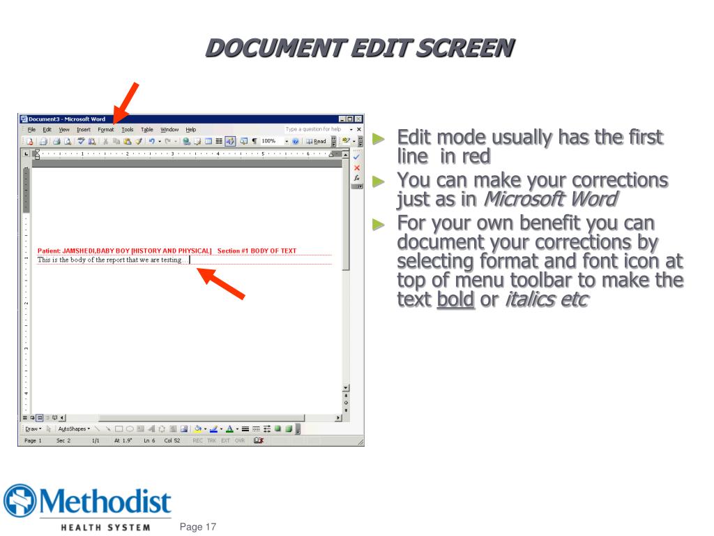 DOCUMENT EDIT SCREEN • Edit mode usually has the first line in red • You can make your corrections just as in Microsoft Word • For your own benefit you can document your corrections by selecting format and font icon at top of menu toolbar to make the text bold or italics etc Page 17