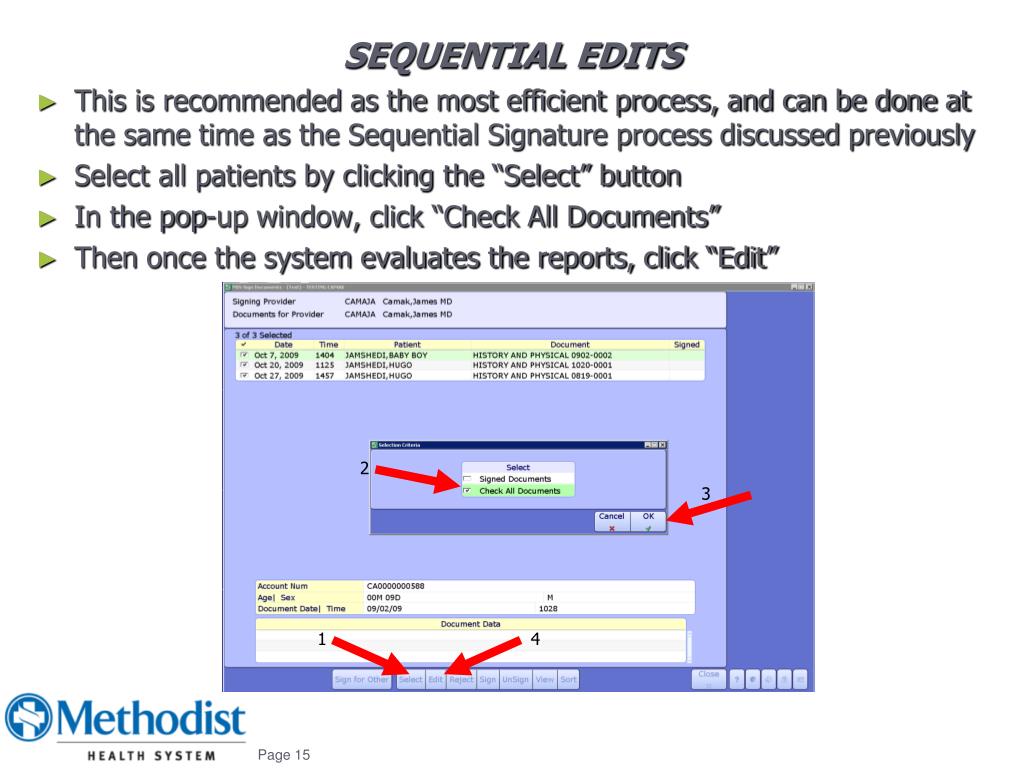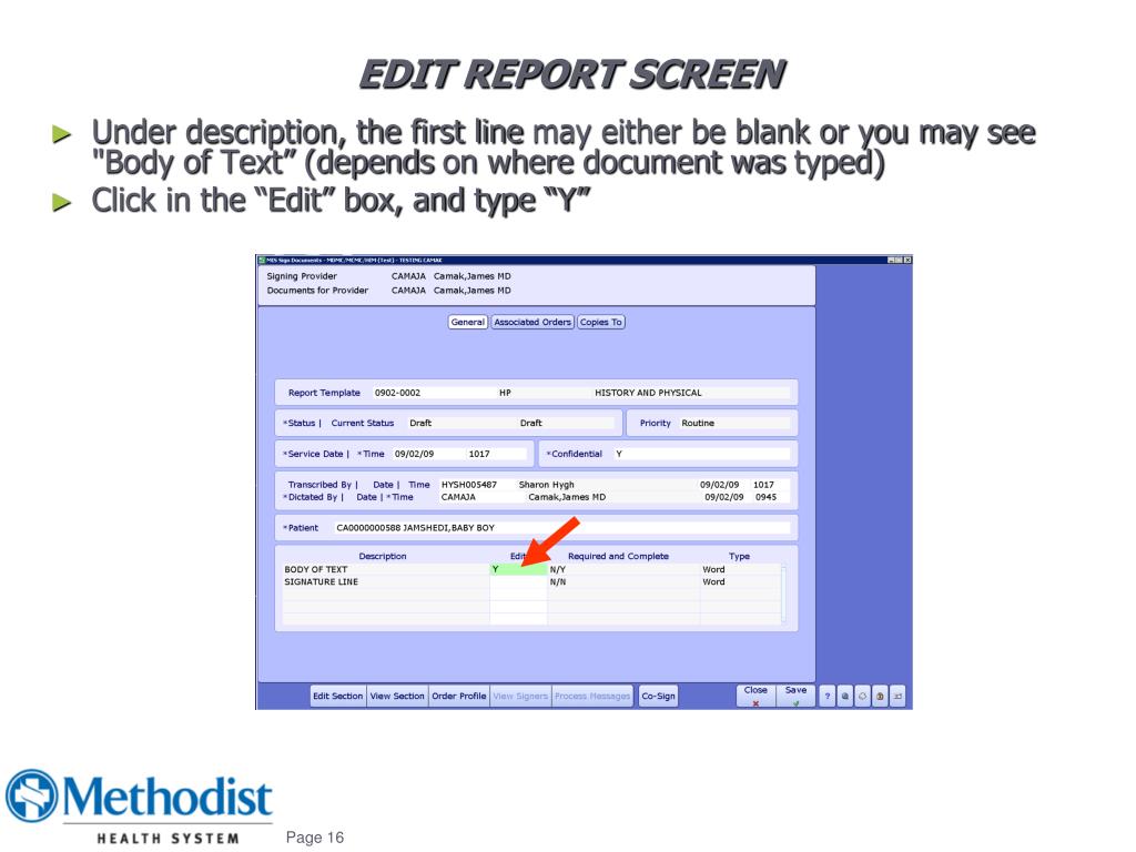 SEQUENTIAL EDITS • This is recommended as the most efficient process, and can be done at the same time as the Sequential Signature process discussed previously • Select all patients by clicking the “Select” button • In the pop-up window, click “Check All Documents” • Then once the system evaluates the reports, click “Edit” 2 3 1 4 May 2008 15 Page 15