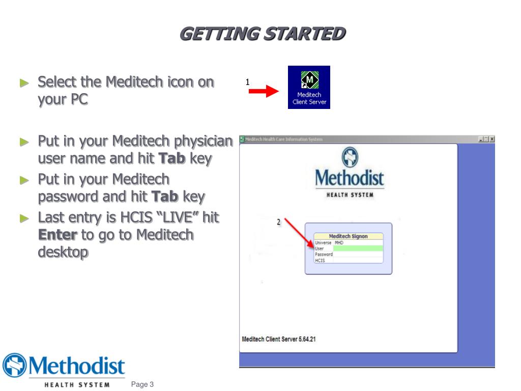 GETTING STARTED 1 • Select the Meditech icon on your PC • Put in your Meditech physician user name and hit Tab key • Put in your Meditech password and hit Tab key • Last entry is HCIS “LIVE” hit Enter to go to Meditech desktop 2 2 Page 3