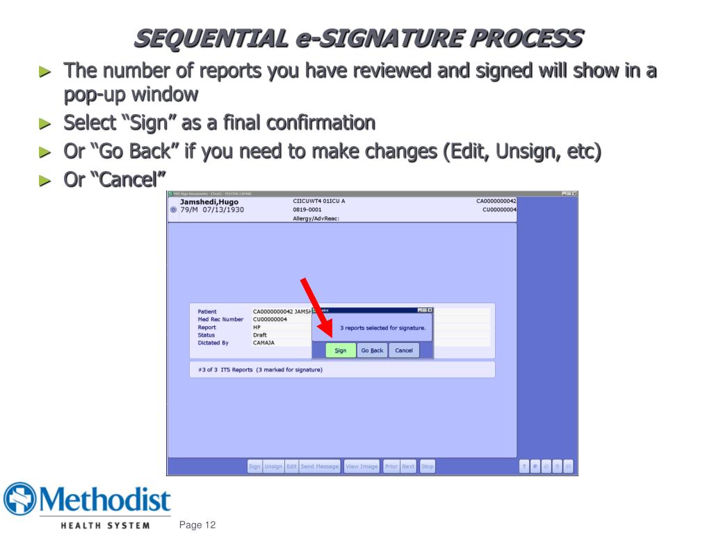 SEQUENTIAL e-SIGNATURE PROCESS • The report(s) will now display • If no changes are necessary, click “Sign”, which will place this signed document in a queue for later signature PIN number completion at end of session. If you need to fix the report, click “Edit” • You will now be taken to the next document for review… • Repeat the steps for each report Page 11