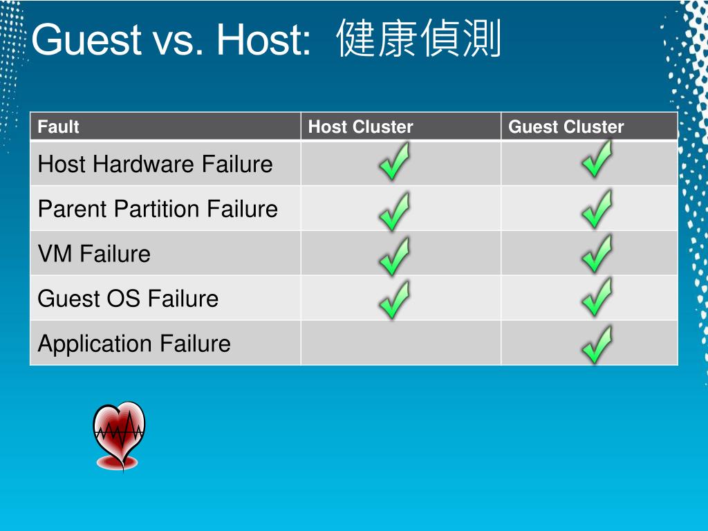 整合 Host & Guest Clustering • 整合兩個世界的彈性跟保護 • VM 在實體節點間的高可用度 & 移動性 • 應用程式及服務在 VM 間的高可用度 & 移動性 • 但是 Cluster-on-a-cluster 會提升整個複雜度 Guest Cluster CLUSTER CLUSTER iSCSI SAN SAN