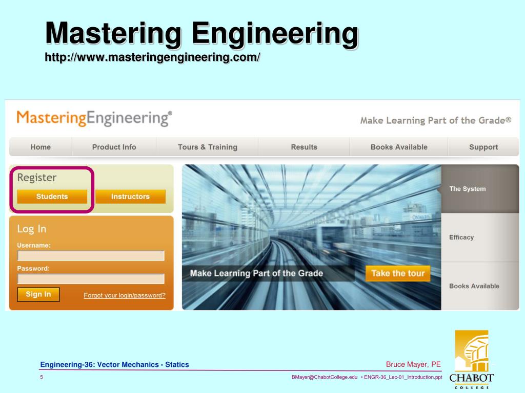 Mastering Engineering: $60.50 http://www.mypearsonstore.com/bookstore/product.asp?isbn=0132915545&xid=PSED • An Access Code is provided with the TextBook Available in the BookStore • Students who purchased the book from another source can purchase Stand-Alone Mastering Engineering for $60.50