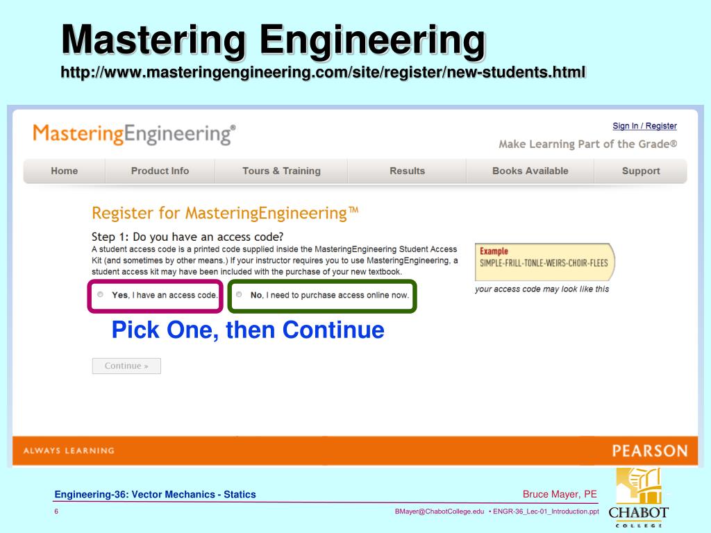 Mastering Engineeringhttp://www.masteringengineering.com/site/register/new-students.html Pick One, then Continue