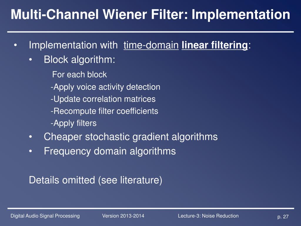 filter coefficients Multi-Channel Wiener Filter: Implementation • Implementation with short-time Fourier transform: see p.10 • Implementation with time-domainlinear filtering: