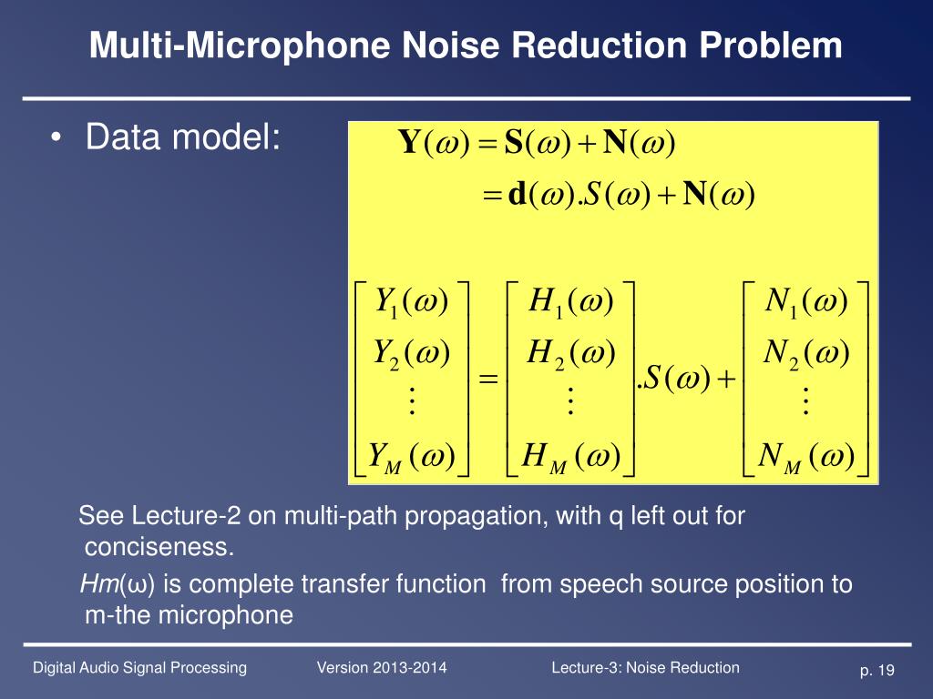 Multi-Microphone Noise Reduction Problem • Data model: See Lecture-2 on multi-path propagation, with q left out for conciseness. Hm(ω) is complete transfer function from speech source position to m-the microphone