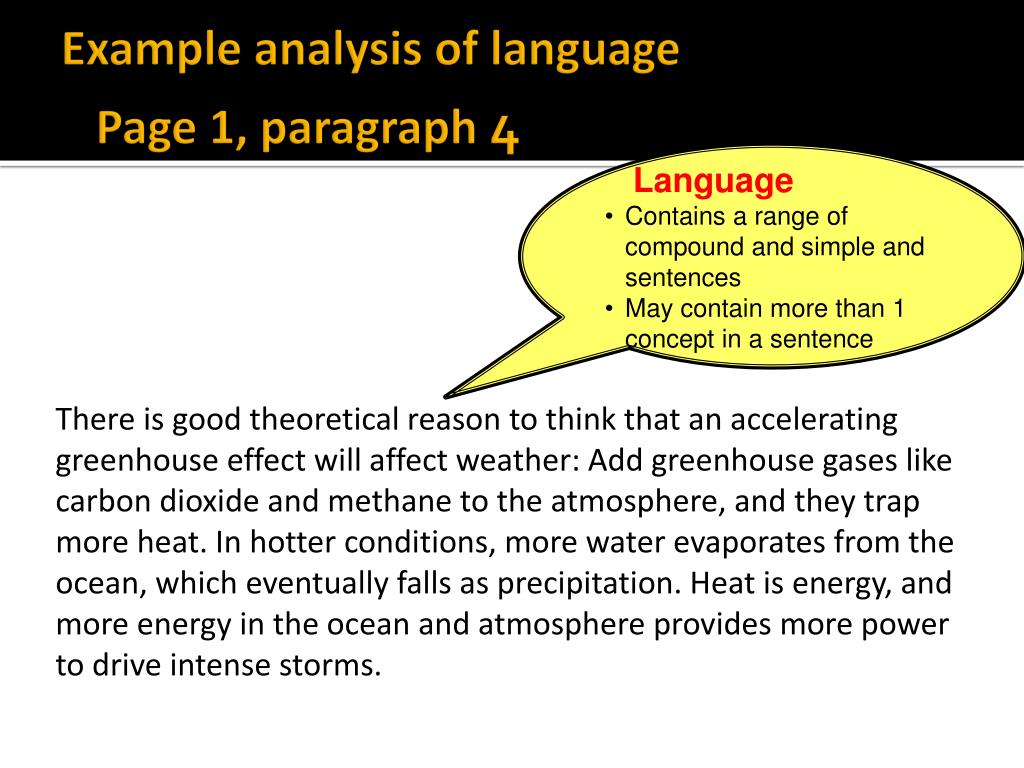 Example analysis of language Page 1, paragraph 4 • Language • Contains a range of compound and simple and sentences • May contain more than 1 concept in a sentence