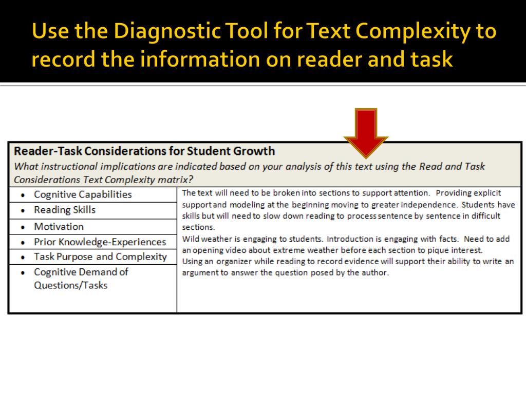 Use the Diagnostic Tool for Text Complexity to record the information on reader and task