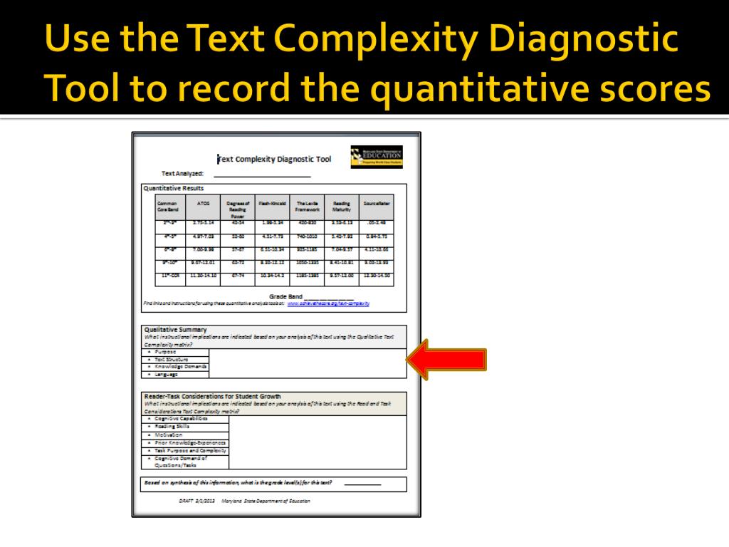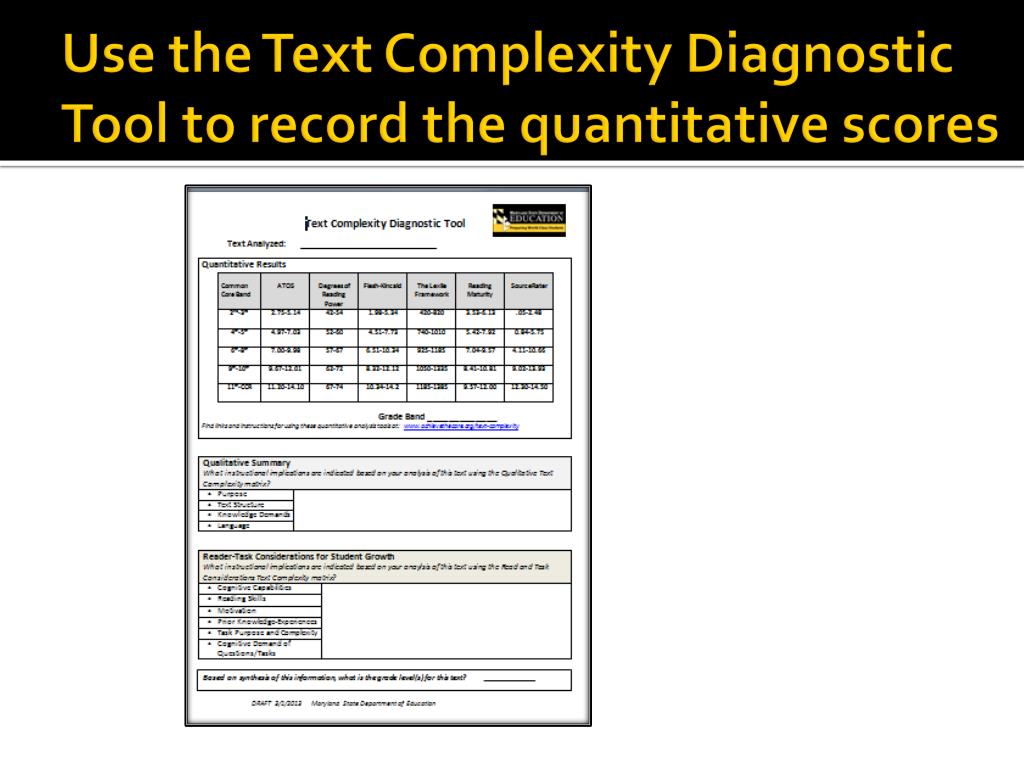 Use the Text Complexity Diagnostic Tool to record the quantitative scores