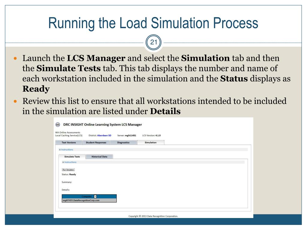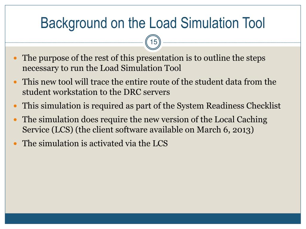 Background on the Load Simulation Tool • The purpose of the rest of this presentation is to outline the steps necessary to run the Load Simulation Tool • This new tool will trace the entire route of the student data from the student workstation to the DRC servers • This simulation is required as part of the System Readiness Checklist • The simulation does require the new version of the Local Caching Service (LCS) (the client software available on March 6, 2013) • The simulation is activated via the LCS