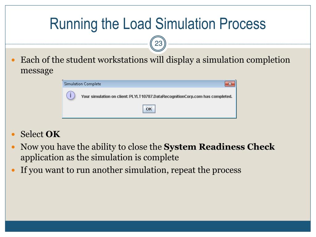 Running the Load Simulation Process • Each of the student workstations will display a simulation completion message • Select OK • Now you have the ability to close the System Readiness Checkapplication as the simulation is complete • If you want to run another simulation, repeat the process