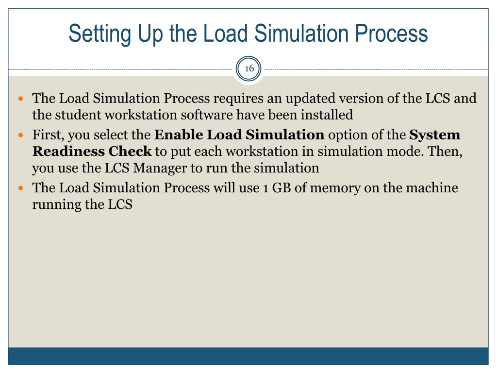 Setting Up the Load Simulation Process The Load Simulation Process requires an updated version of the LCS and the student workstation software have been installed First, you select the Enable Load Simulation option of the System Readiness Check to put each workstation in simulation mode. Then, you use the LCS Manager to run the simulation The Load Simulation Process will use 1 GB of memory on the machine running the LCS