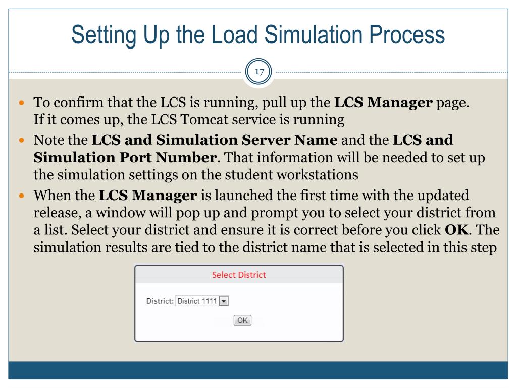 Setting Up the Load Simulation Process • To confirm that the LCS is running, pull up the LCS Manager page. If it comes up, the LCS Tomcat service is running • Note the LCS and Simulation Server Name and the LCS and Simulation Port Number. That information will be needed to set up the simulation settings on the student workstations • When the LCS Manager is launched the first time with the updated release, a window will pop up and prompt you to select your district from a list. Select your district and ensure it is correct before you click OK. The simulation results are tied to the district name that is selected in this step