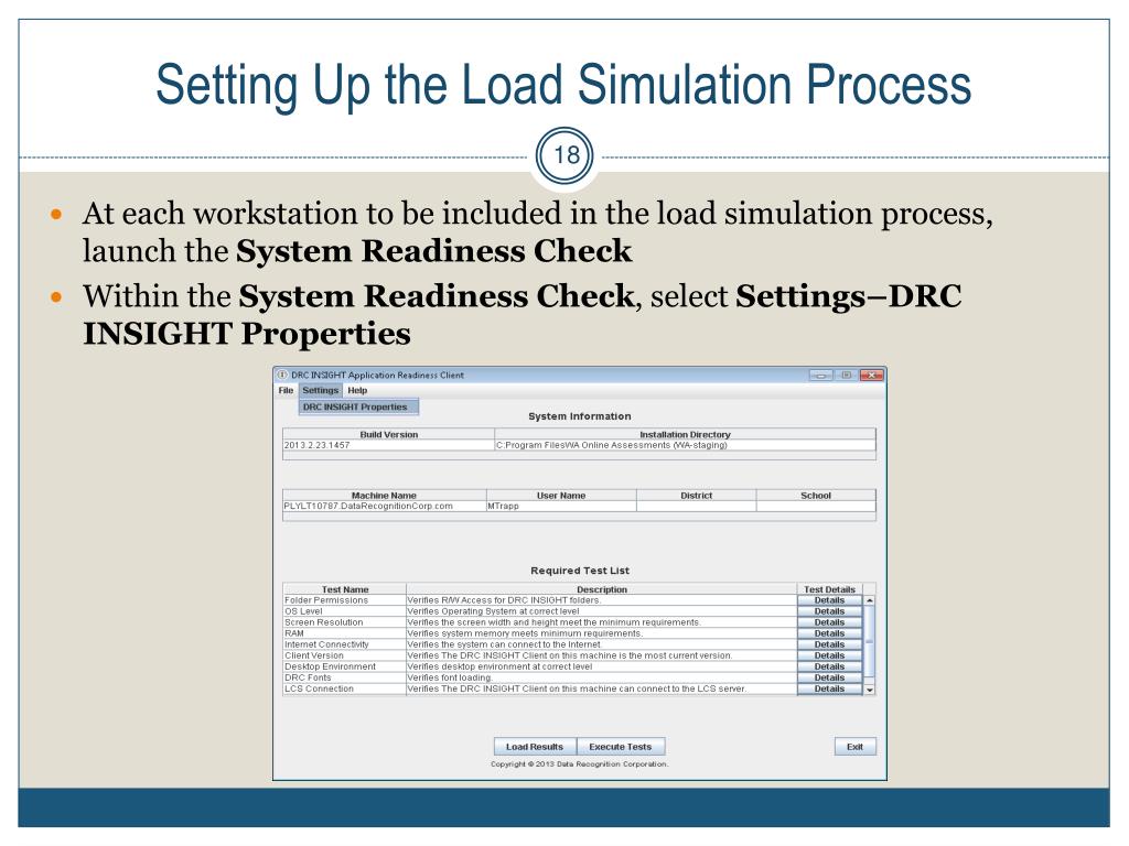 Setting Up the Load Simulation Process • At each workstation to be included in the load simulation process, launch the System Readiness Check • Within the System Readiness Check, select Settings–DRC INSIGHT Properties