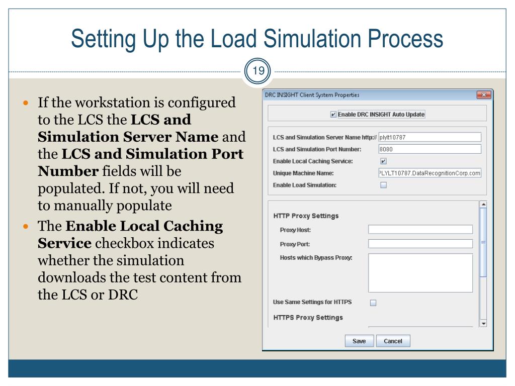 Setting Up the Load Simulation Process • If the workstation is configured to the LCS the LCS and Simulation Server Name and the LCS and Simulation Port Number fields will be populated. If not, you will need to manually populate • The Enable Local Caching Service checkbox indicates whether the simulation downloads the test content from the LCS or DRC