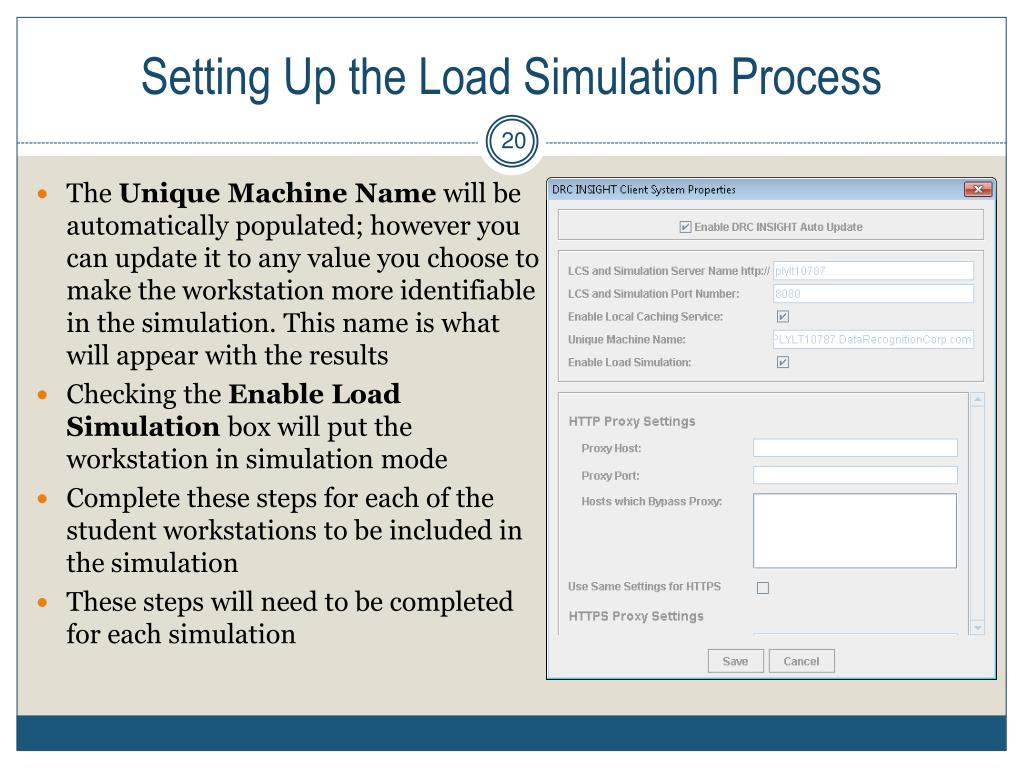 Setting Up the Load Simulation Process • The Unique Machine Name will be automatically populated; however you can update it to any value you choose to make the workstation more identifiable in the simulation. This name is what will appear with the results • Checking the Enable Load Simulation box will put the workstation in simulation mode • Complete these steps for each of the student workstations to be included in the simulation • These steps will need to be completed for each simulation