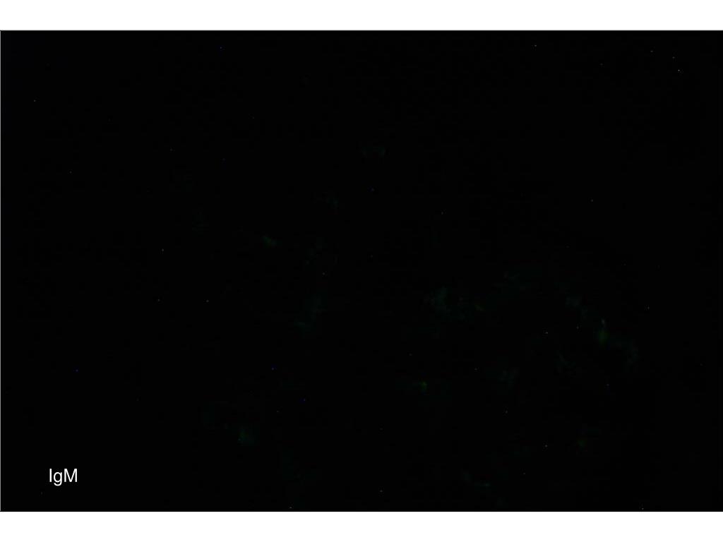 IF • IgG-Negative. • IgA- Mild mesangial staining. • IgM- Trivial to mild mesangial staining. • C3- Mild to moderate mesangial staining. Moderate vascular staining. • C1q-Negative. • Kappa-Negative. • Lambda- Mild mesangial staining. • Fibrinogen- Moderate interstitial staining. • Albumin-Negative.