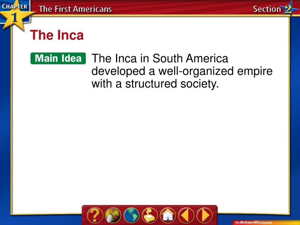 The Inca The Inca in South America developed a well-organized empire with a structured society. Section 2