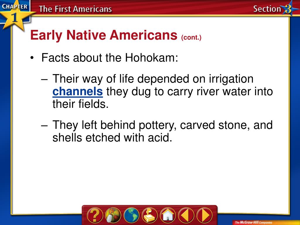 Early Native Americans (cont.) • Facts about the Hohokam: • Their way of life depended on irrigation channels they dug to carry river water into their fields. • They left behind pottery, carved stone, and shells etched with acid. Section 3