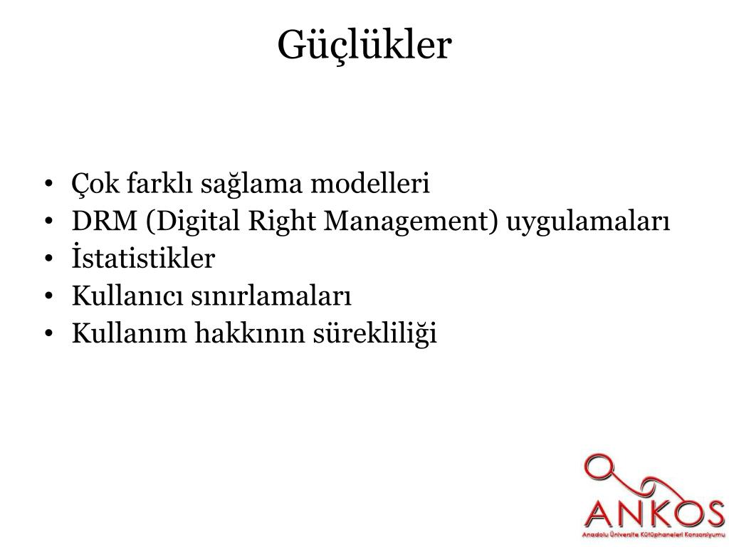 Güçlükler • Çok farklı sağlama modelleri • DRM (Digital Right Management) uygulamaları • İstatistikler • Kullanıcı sınırlamaları • Kullanım hakkının sürekliliği
