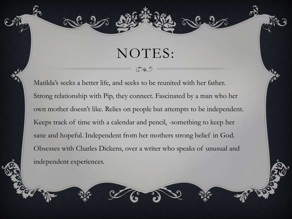 NOTES: Matilda’s seeks a better life, and seeks to be reunited with her father. Strong relationship with Pip, they connect. Fascinated by a man who her own mother doesn’t like. Relies on people but attempts to be independent. Keeps track of time with a calendar and pencil, -something to keep her sane and hopeful. Independent from her mothers strong belief in God. Obsesses with Charles Dickens, over a writer who speaks of unusual and independent experiences.