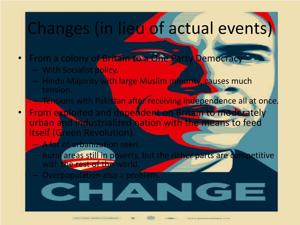 Changes (in lieu of actual events) • From a colony of Britain to a One Party Democracy • With Socialist policy. • Hindu Majority with large Muslim minority, causes much tension. • Tensions with Pakistan after receiving independence all at once. • From exploited and dependent on Britain to moderately urban and industrialized nation with the means to feed itself (Green Revolution). • A lot of urbanization seen. • Rural areas still in poverty, but the richer parts are competitive with the rest of the world. • Overpopulation also a problem.