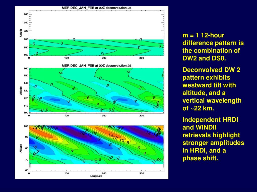 m = 1 12-hour difference pattern is the combination of DW2 and DS0. Deconvolved DW 2 pattern exhibits westward tilt with altitude, and a vertical wavelength of ~22 km. Independent HRDI and WINDII retrievals highlight stronger amplitudes in HRDI, and a phase shift. Deconvolved DW2 lon-ht