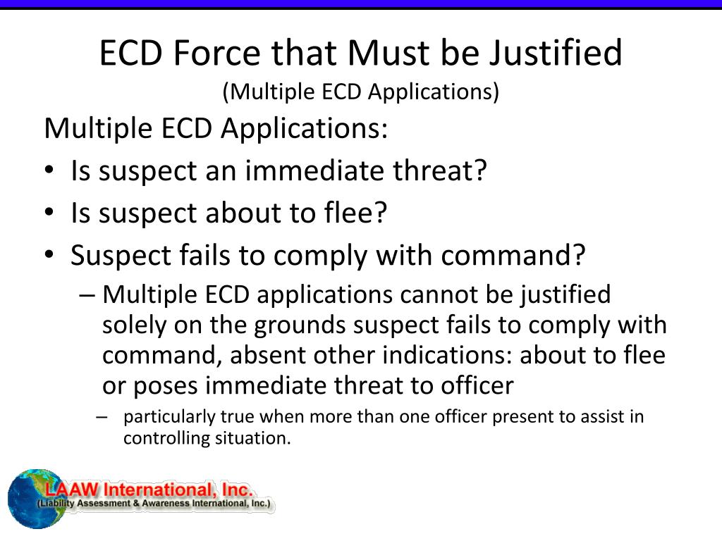 ECD Force that Must be Justified(Multiple ECD Applications) Multiple ECD Applications: • Is suspect an immediate threat? • Is suspect about to flee? • Suspect fails to comply with command? • Multiple ECD applications cannot be justified solely on the grounds suspect fails to comply with command, absent other indications: about to flee or poses immediate threat to officer • particularly true when more than one officer present to assist in controlling situation.