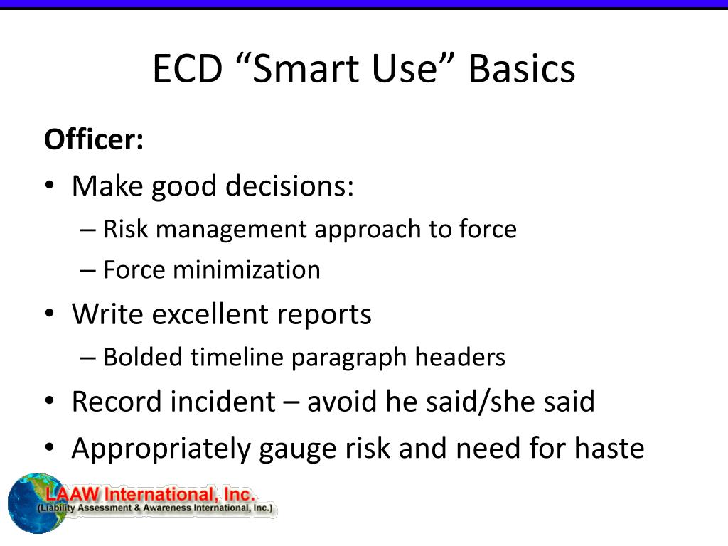 ECD “Smart Use” Basics Officer: • Make good decisions: • Risk management approach to force • Force minimization • Write excellent reports • Bolded timeline paragraph headers • Record incident – avoid he said/she said • Appropriately gauge risk and need for haste