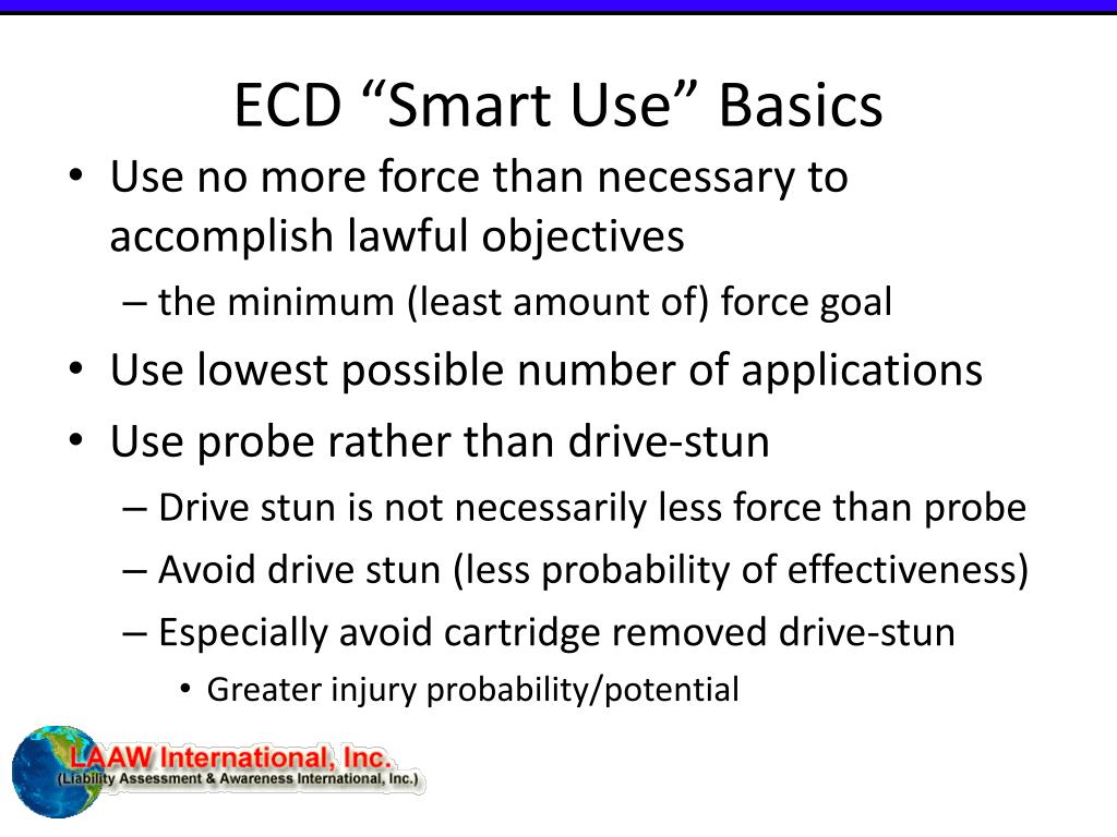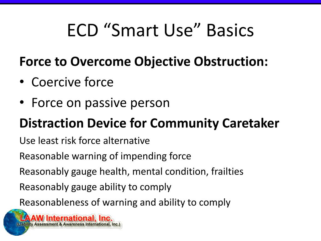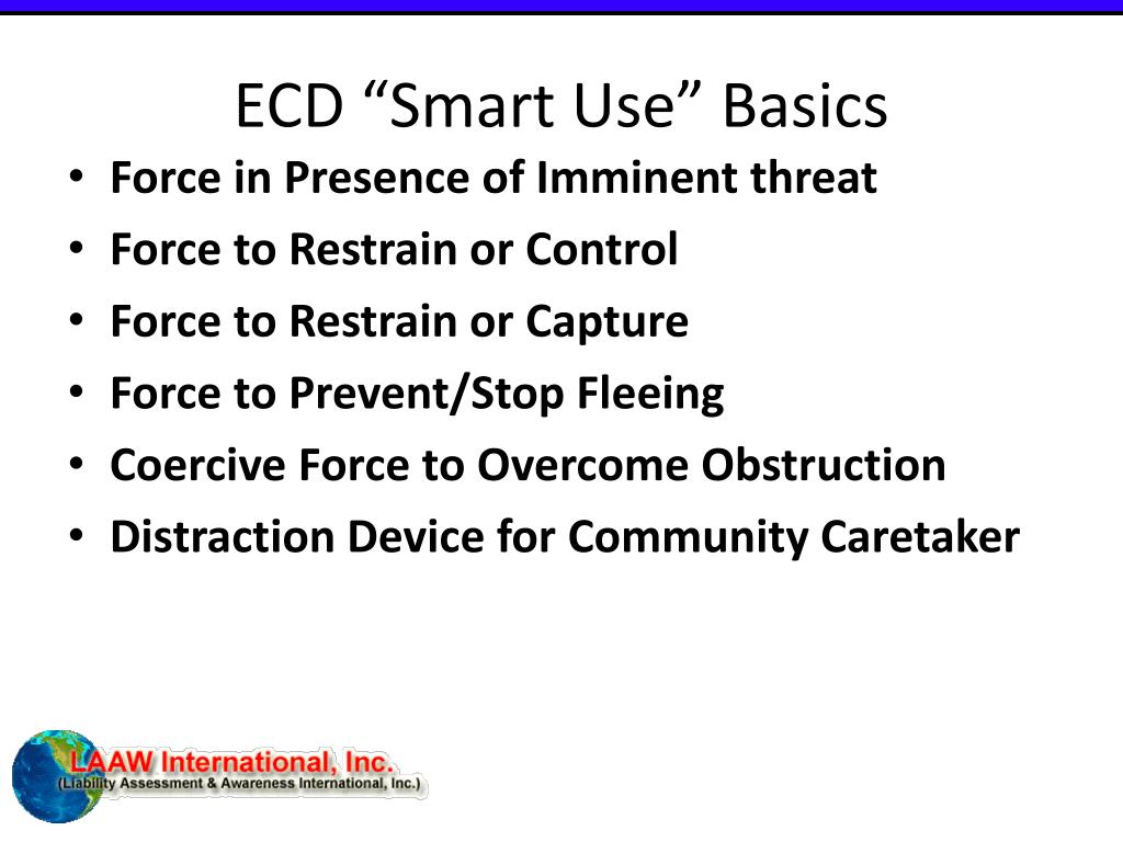 ECD “Smart Use” Basics ECD “Smart Use” is NOT a Constitutional or legal force standard. ECD “Smart Use” are ECD force considerations presented for discussion in an effort to maintain officer safety while minimizing ECD force and negative consequences of ECD force.