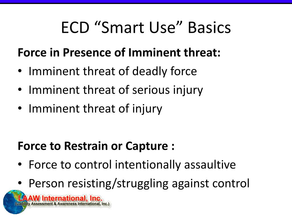 ECD “Smart Use” Basics Force in Presence of Imminent threat: • Imminent threat of deadly force • Imminent threat of serious injury • Imminent threat of injury Force to Restrain or Capture : • Force to control intentionally assaultive • Person resisting/struggling against control