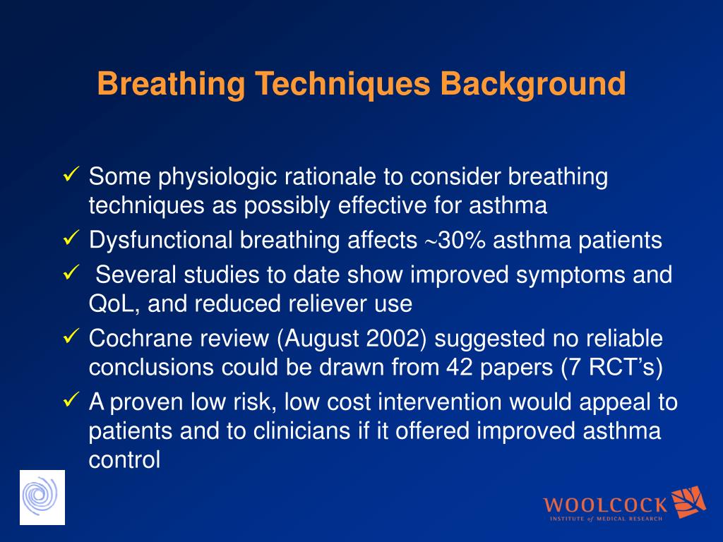 Breathing Techniques Background • Some physiologic rationale to consider breathing techniques as possibly effective for asthma • Dysfunctional breathing affects 30% asthma patients • Several studies to date show improved symptoms and QoL, and reduced reliever use • Cochrane review (August 2002) suggested no reliable conclusions could be drawn from 42 papers (7 RCT’s) • A proven low risk, low cost intervention would appeal to patients and to clinicians if it offered improved asthma control