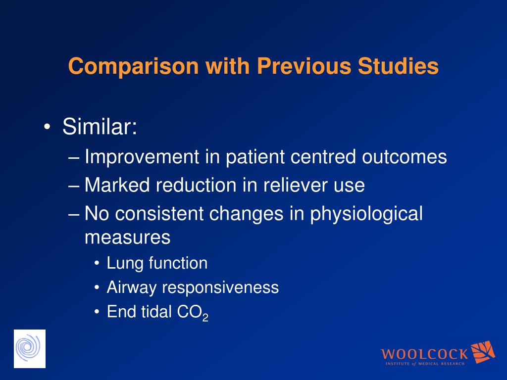 Comparison with Previous Studies • Similar: • Improvement in patient centred outcomes • Marked reduction in reliever use • No consistent changes in physiological measures • Lung function • Airway responsiveness • End tidal CO2