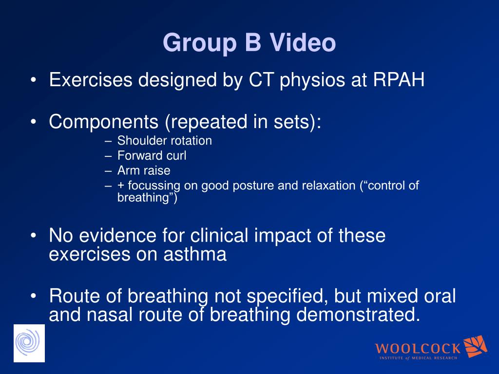 Group B Video • Exercises designed by CT physios at RPAH • Components (repeated in sets): • Shoulder rotation • Forward curl • Arm raise • + focussing on good posture and relaxation (“control of breathing”) • No evidence for clinical impact of these exercises on asthma • Route of breathing not specified, but mixed oral and nasal route of breathing demonstrated.